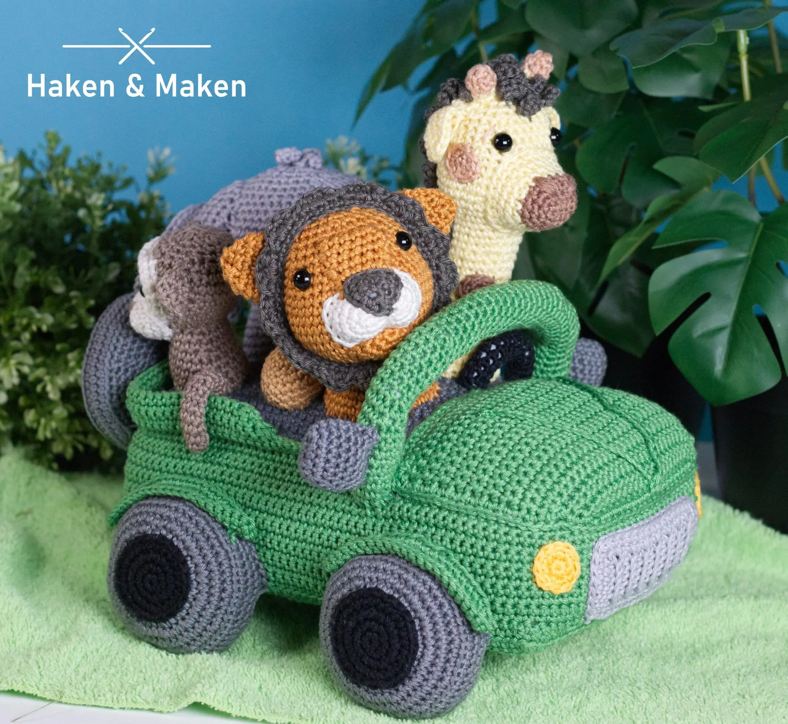 Haak en Maak je eigen Jungle! In dit boek gaan Jilani en Jamilla op safari en komen de ondeugende aapjes Mike en Mael tegen. Ook de patronen van de lieve maar vooral stoere leeuwen Alex en Amir staan in het boek. Anouk het baby olifantje houdt de staart van haar moeder stevig vast om niet te verdwalen en de giraffen Gerrit en gijsje staan op de uitkijk en knabbelen ondertussen aan een paar heerlijke blaadjes. En natuurlijk is daar ook de Jungle jeep! Gijsje, Amir, Anouk en Mael houden zich stevig vast. De jeep kan je haken met of zonder muziekdoosje en de jeep staat natuurlijk geweldig op elke jungle kamer of…misschien is het wel je pronkstuk op een stoere luiertaart?