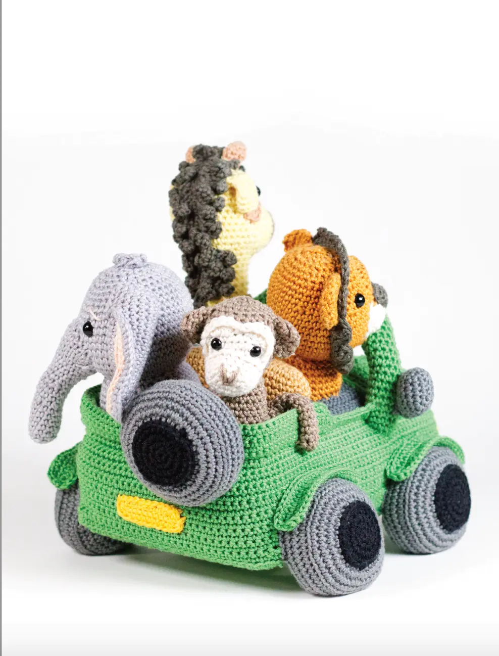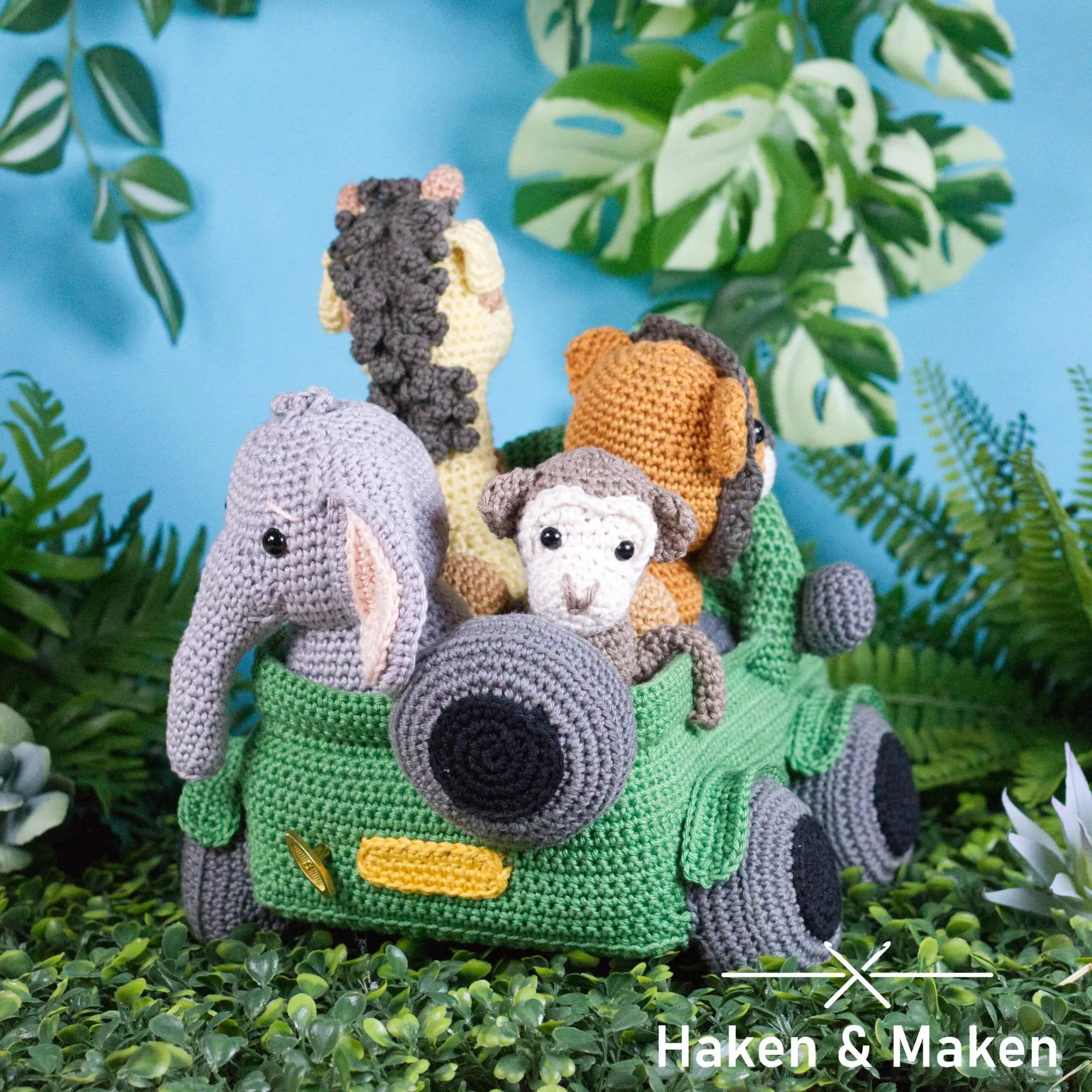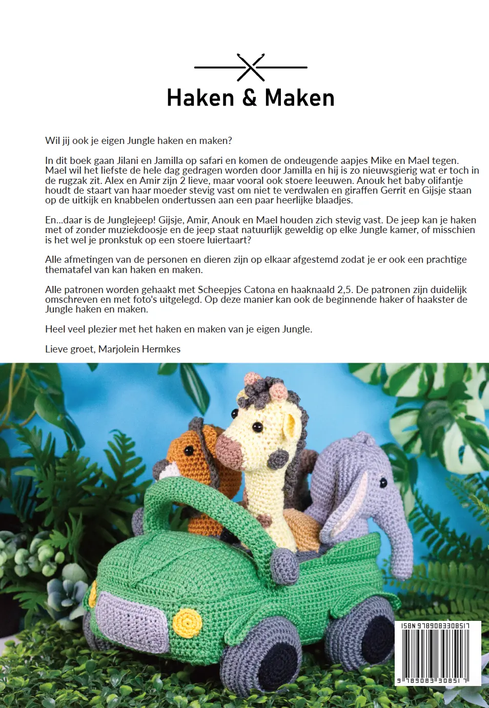 Haak en Maak je eigen Jungle! In dit boek gaan Jilani en Jamilla op safari en komen de ondeugende aapjes Mike en Mael tegen. Ook de patronen van de lieve maar vooral stoere leeuwen Alex en Amir staan in het boek. Anouk het baby olifantje houdt de staart van haar moeder stevig vast om niet te verdwalen en de giraffen Gerrit en gijsje staan op de uitkijk en knabbelen ondertussen aan een paar heerlijke blaadjes. En natuurlijk is daar ook de Jungle jeep! Gijsje, Amir, Anouk en Mael houden zich stevig vast. De jeep kan je haken met of zonder muziekdoosje en de jeep staat natuurlijk geweldig op elke jungle kamer of…misschien is het wel je pronkstuk op een stoere luiertaart?