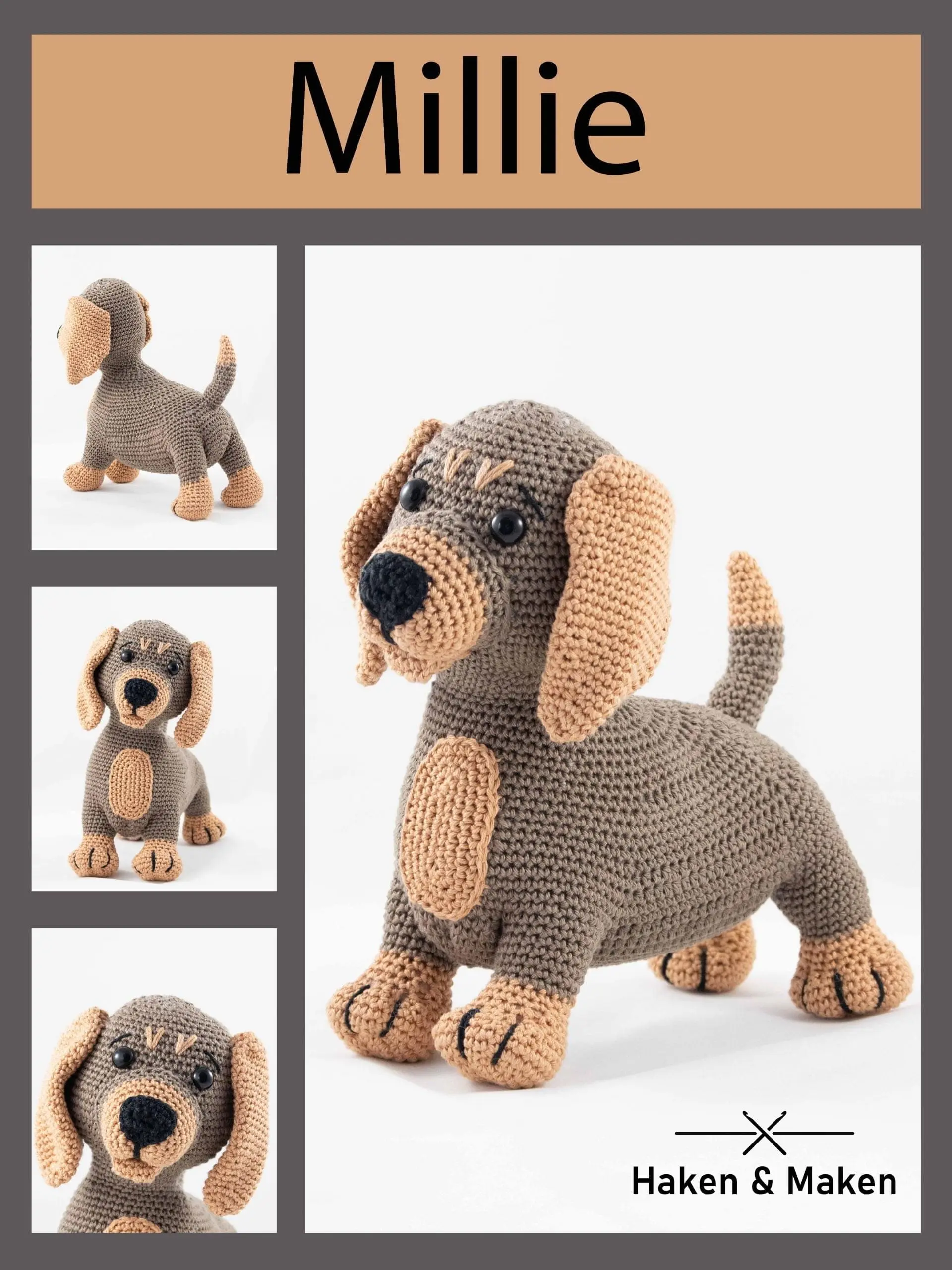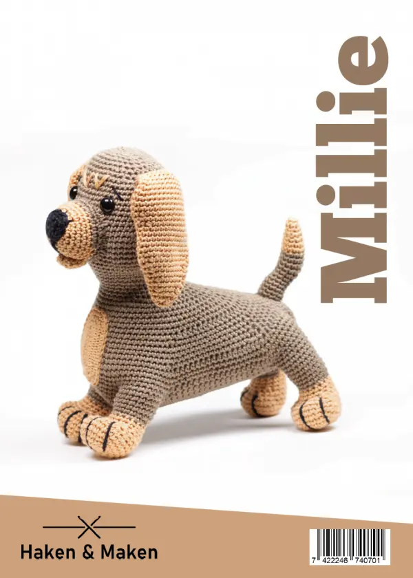 Millie wordt ongeveer 21 cm hoog en 20 cm lang wanneer je hem haakt met het aangegeven garen en haaknaald.