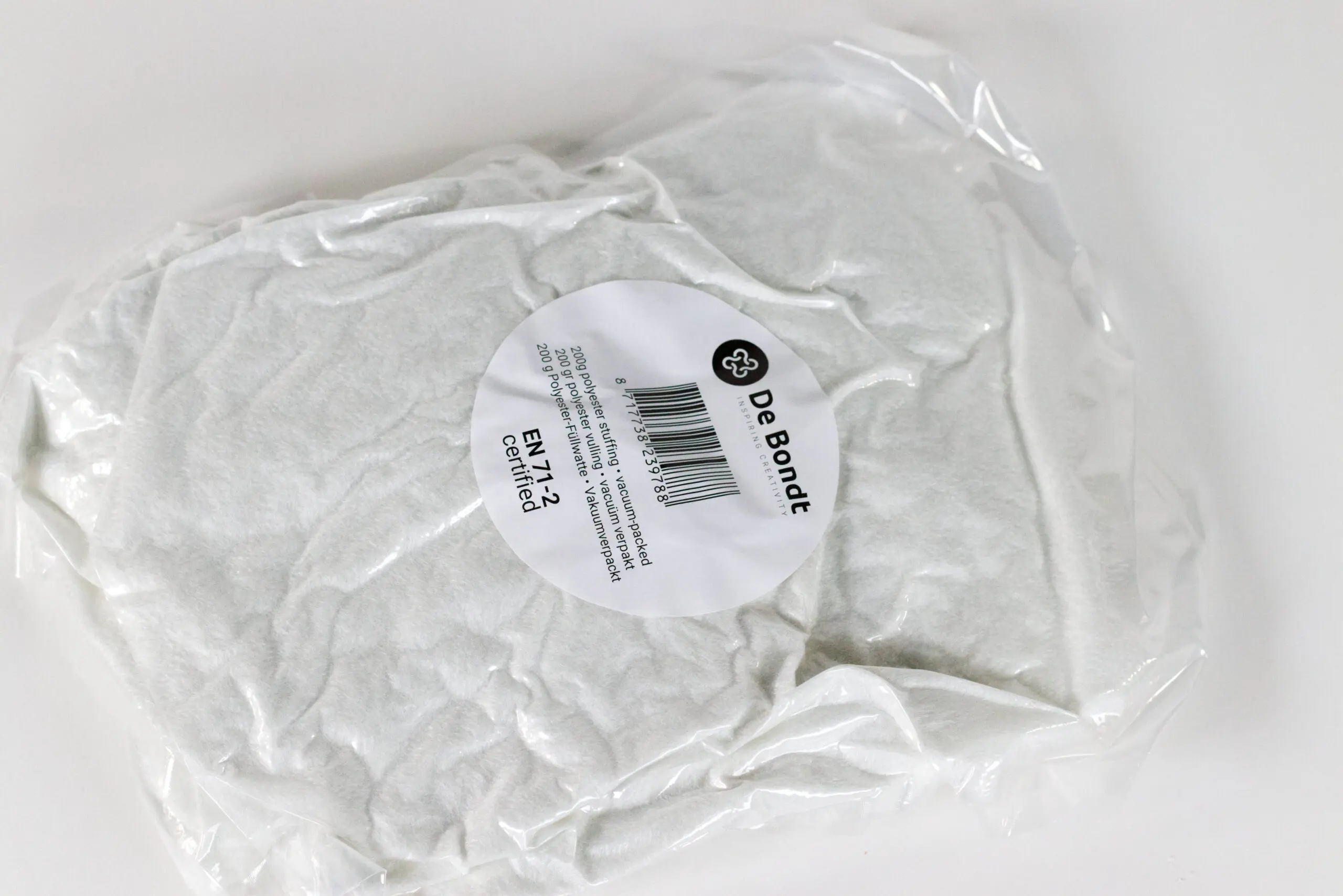 De zak van 200 gram is voldoende om een knuffel te vullen.
